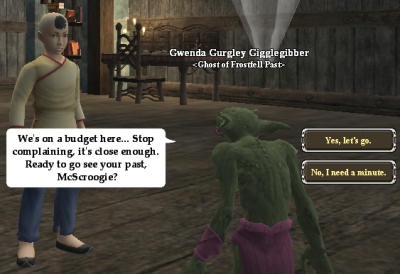 | | La quête de McScroogle | Elle est de votre niveau et pleine d'humour, les anglophones se régaleront. L'objectif principal est de montrer à ce monsieur qui est tristounet et aigri ce que son vilain caractère fait de sa vie. Vous devez donc aller fouiller dans sa vie (passé, présent et futur) pour découvrir ses erreurs et voir comment améliorer son caractère afin de le rendre meilleur. Vous voilà téléportés chez lui et vous vous retrouvez dans son boudoir, transformés en lui-même, loin dans son passé. Vous voyez l'essence de ce qui reste de votre personnage près de la porte, et à côté, Gwenda une Gigglegibber. Elle sera votre guide pendant la partie 'passé' de la quête de la vie de McScroogle. On commence par sa petite amie, après voir discuté avec Gwenda, elle vous envoie à sa rencontre, transformé en gamin avec une houppette (faute de mieux et de budget dira Gwenda). Vous voilà dans un salon avec des invités, un festin sur la table, nous sommes 32 ans en arrière en période de Frostfell, au moment ou son amie l'a ... hum ... quitté. Il s'agit donc de lui parler et d'éviter de refaire les mêmes erreurs. Lani Cogspinner vous enguirlande parce que vous arrivez en retard et qu'à cause de vous la dinde est froide. Vous avez alors plusieurs choix de réponses, de la plus mature à la plus macho... les plus aimantes étaient les premières, les plus délirantes les dernières. Et vous pouvez vous lâcher, même une demande en mariage ne la fera pas changer d'avis ... elle vous quitte pour un homme qui a plus de coeur. De retour devant Gwenda, vous pourrez lui dire que vous avez compris cette leçon. Elle vous renvoie au boudoir, mais votre guide est maintenant un gros ogre Gergus, qui d'ailleurs est persuadé d'être un gobelin, sa maman lui a juste dit qu'il avait grandi trop vite. Lui va vous faire travailler sur votre présent et vous envoie découvrir la vie d'un de vos employés que vous traitez très mal. Il s'agit de vous rattraper en lui donnant de quoi il a besoin. Vous obtiendrez pour cela un paquet et un morceau de dinde. - En approchant du petit Jim vous l'entendrez se lamenter de n'avoir de présents pour Noël. - Près de Bobby il dira à sa femme qu'il est désolé de ne pouvoir débarrasser la table car il doit retourner travailler pour le méchant McScroogle s'il veut garder son emploi. - Gandma Shawna est dépité de nous pouvoir donner de la dinde pour le repas. - Et Grandpa Jack de plaint du froid car il n'arrive pas à faire démarrer le poêle. Les solutions sont simples : - A côté de Jim vous examinez le paquet qui est dans votre inventaire et cela fera apparaître des cadeaux près du sapin. - Cliquez sur la vaisselle sale sur la table pour la faire disparaître. - Examinez le morceau de dinde dans votre inventaire près de Shawna pour faire apparaître de la nourriture sur le fourneau. - Enfin cliquez une dizaine de fois sur le poêle devant Jack pour le faire démarrer. Voila, l'appartement cossu prend maintenant un petit air plus joyeux. Votre leçon était de constater combien vous traitez mal vos employés, vous avez réparé votre erreur, vous promettez d'augmenter Bobby dès demain, et c'est terminé pour cette étape 'présent'. Dans le boudoir, c'est Gilby le gobelin qui vous attend pour l'étape 'futur'. Brrr vous voila dans une zone de glace, et Gilby vous informe que vous rencontrerez votre futur au centre du labyrinthe et que vous aurez des obstacles et des surprises sur votre chemin. Les obstacles ce sont quelques monstres très faciles à tuer surtout avec les sorts qui vous ont été octroyés, ne les craignez donc pas. Les surprises par contre ce sont les personnes qui ont croisé le chemin de McScroogle et qui parlent de lui en disant qu'il a raté sa vie, qu'il a été méchant voir même son comptable qui l'a arnaqué ou les agents du fisc. Tout cela pour finir au centre du labyrinthe (qui est sur la gauche depuis le départ) sur ... sa tombe. Une chouette vie que voilà, mourir seul et pauvre ! Retournez voir Gilby afin d'admettre que vous aller faire mieux et devenir plus gentil et il vous renvoie dans Frostfell pour aller à la rencontre de McScroogle afin d'en terminer. Bon la morale de l'histoire ... c'est que McScroogle se fiche complètement de l'expérience que vous voulez partager avec lui et que vous ne le changerez pas. Tant pis pour lui vous aurez fait de votre mieux, et repartirez quand même avec un livre qui résume avec beaucoup d'humour la vie du monsieur, et une jolie cape.