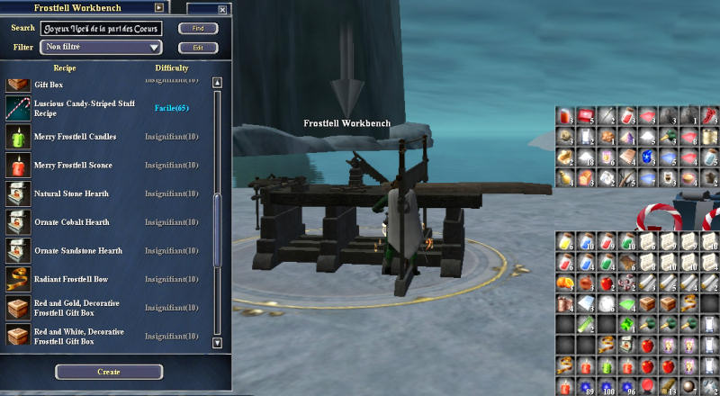 | | Les recettes de Frostfell | Il y a cinq livres de recettes a acheter auprès soit du vendeur à l'entrée, soit des vendeurs près des ateliers. La particularité de toutes ces recettes c'est qu'elles demandent des ingrédients spéciaux que vous ne trouverez que sur les îles de Frostfell village. Ces composants se trouvent dans les paquets de cadeaux à ramasser un peu partout sur toutes les îles, il y en a trois par paquets, un peu comme les ressources classiques. |  |