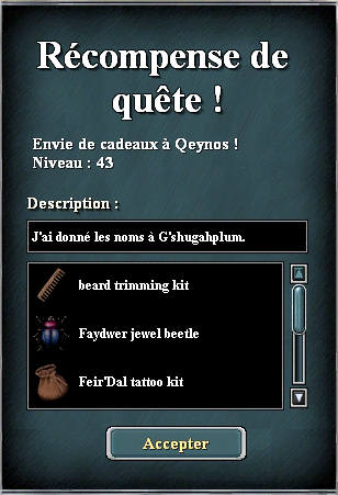 La quête s'appelle : Envie de cadeaux et en voici le descriptif pour la version Qeynosienne. Elle se déroule en deux parties : - Le gobelin vous demande d'identifier quelles sont les personnes auxquelles il a pensé pour offrir des cadeaux. Il n'en connaît pas leur nom, juste une description. Vous pourrez les repérer sur votre carte, ils clignotent comme un pnj de quête normal. 1 - L'homme aux cheveux blancs (Gemelles) se trouve sur le ponton dans les douves du chateau de Qeynos Nord 2 - Le petit chauve aux flèche (Linst) se trouve à la maison des archers d'Elddar 3 - Le garçon ailé (Panvali) est un fae dans le carré devant le dojo des moines d'Elddar 4 - Le grand gris (Thabit) est l'érudit dans la maison en haut de l'arbre d'Elddar 5 - Le gros visage bleu (Gowan) est le barbare dans le magasin d'Elddar 6 - La fille endormie (Nonnie) est dans le magasin de meubles de Qeynos nord.
