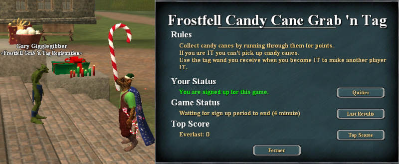 Frostfell Candy Cane Grab'n Tag La première, il s'agit d'un jeu de récolte qui se déroule tous les quarts d'heure. Vous avez 9 minutes pour vous inscrire et 4 pour y jouer. Je n'en dirais pas plus car pour l'instant le jeu ne semble pas au point du tout. Tout ce que je peux affirmer c'est qu'on gagne de quoi se transformer en bonhomme de neige. |  |