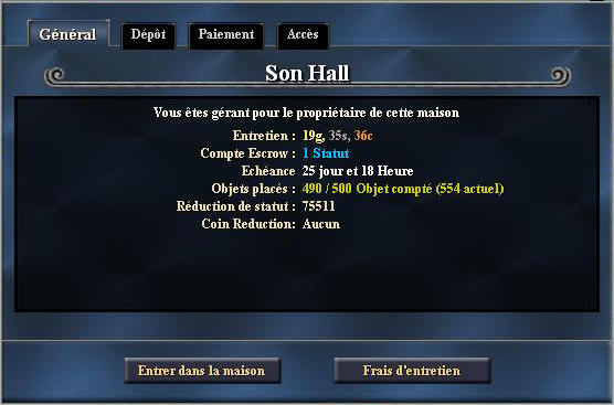 Prix d'achat : 3p, 87g, 24s, 250.000 Statut Location : 15g, 48s, 96c, 50.000 Statut 5 slots broker 5 Karana Court - Qeynos Sud (centre) 5 Erollisi Lane - Qeynos Sud (nord) 8 Erollisi Lane - Qeynos Sud (nord) |  |