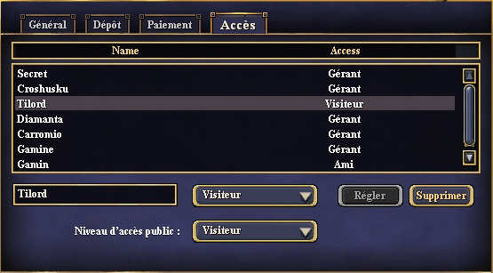 Pour régler le niveau d'accès pour un joueur précis, renseignez son nom et choisissez le niveau dans la liste déroulante à côté, puis validez par Régler. Attention toute modification liée à un joueur lui enverra un message directement. Ainsi si vous donnez les droits de gérance à un ami, après validation il recevra un message pour l'informer de cette modification à son égard.