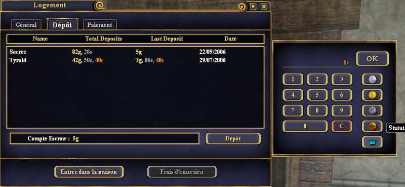 | Dépôt Sont listés ici les dépositaires des loyers et le total des montants payés par chacun. Vous ne pouvez payer votre loyer que 4 semaines maximum d'avance. Si vous voulez déposer plus, vous pouvez laisser une avance pour les prochains loyers via la touche Dépôt, le montant sera déposé alors sur le compte nommé Escrow. Attention ce compte Escrow n'est qu'une réserve d'argent, il n'est pas automatiquement ponctionné par le jeu pour payer votre loyer. Vous pouvez aussi faire un dépôt en status points via le bouton en forme de couronne bleue. |  |