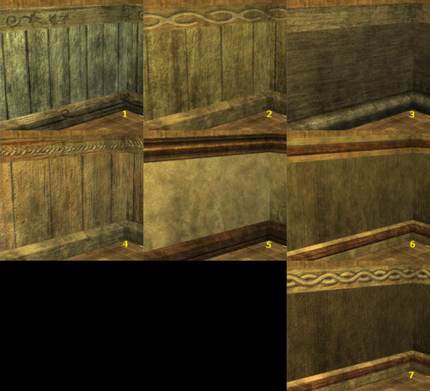 | Bas de mur 1 - Par défaut : Bois de saule crénelé 2 - 1g28s : Chêne non poli 3 - 2g56s : Chêne traditionnel 4 - 5g12s : Chêne supérieur 5 - 10g24s : Eldar opulent 6 - 20g48s : Eldar extravagant 7 - 40g96s : Riche eldar