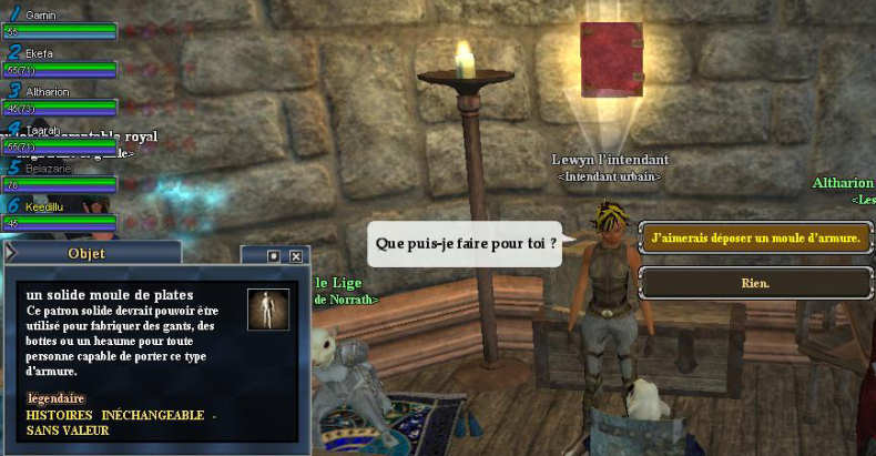 Sur les boss de ces différentes missions vous aurez l'occasion de faire tomber des bons pour des pièces d'armure spéciales, qui se répartissent en 4 catégories classiques : toile, cuir, mailles et plate. Ces bons sont à restituer auprès de l'intendant proche du comptable qui vous les échangera par une pièce choisie dans la liste. Faites un clic droit sur l'objet pour lancer la quête qui vous permettra de valider votre pièce auprès de l'intendant. Leur niveau est à peu près équivalent à celui du même tier légendaire d'artisanat. |  |