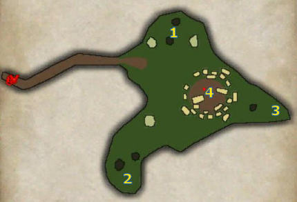 Dans cette zone vous constaterez 4 petites baraques et au fond une plus grande avec un mur bas de séparation devant. Dans chacune de ces 4 baraques se trouvent les soeurs, filles de Znedari, qu'il faudra défaire pour ouvrir la protection menant à leur mère dans la grande baraque du fond.