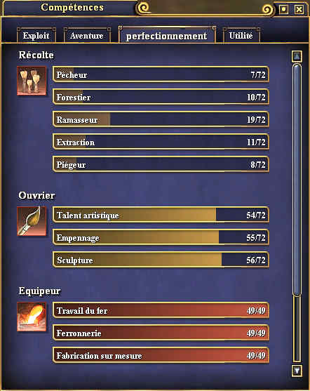 Les skills de craft : Même principe de actuel/max mais les max dépendent du lvl de craft. Lorsque vous allez vous spécialiser, le maximum Des skills dépendant de votre spécialisation vont continuer à augmenter, par contre les autres maximum ne bougeront plus.