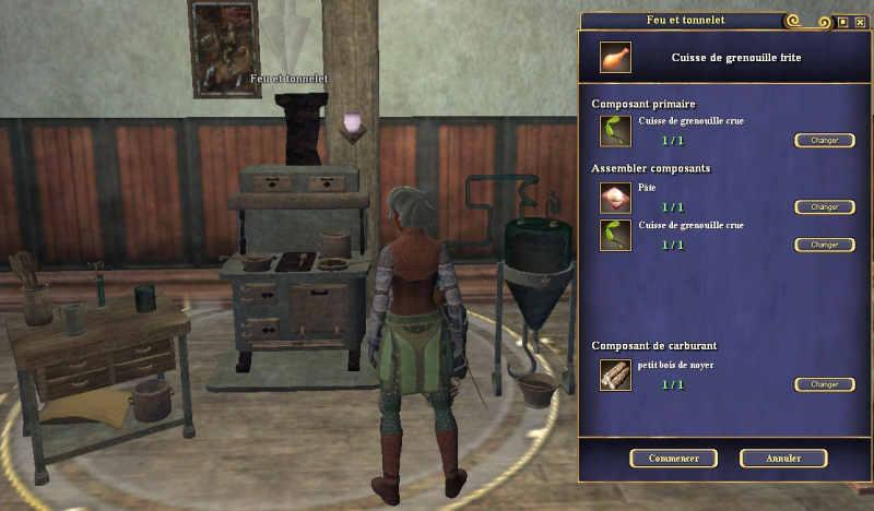 Une fois ces éléments réunis, rendez-vous à l'etelier se nommant "Feu et tonnelet" dans l'instance de craft. Cliquez dessus, cela fera apparaître la liste des recettes que vous pouvez crafter à votre level. Selectionnez la recette, puis cliquez sur créer. Cela vous fera apparaître les éléments utilisés pour crafter la recette. Cliquez sur commencez pour faire démarrer la recette.