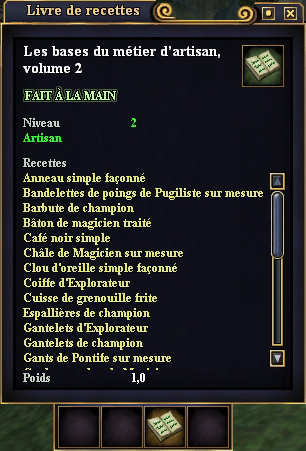 | Cette action faite, vous passez automatiquement artisan level 2 et vous recette votre premier livre de recette : "Les Bases du métier d'artisan, volume 2". Ce n'est pas la peine de chercher le volume 1, il n'existe pas.
