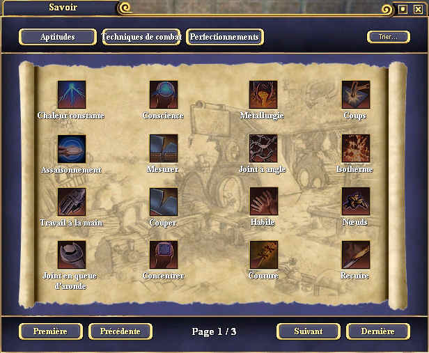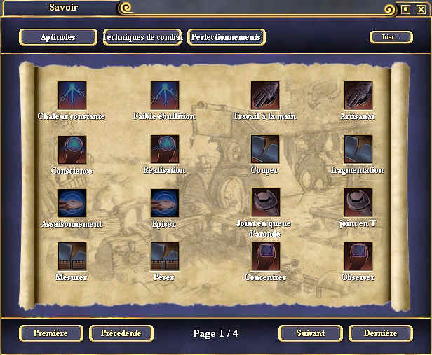 | | Vos premiers sorts de craft | Avant de commencer vos premiers craft, vous pouvez ouvrir votre livre de Savoir où il y a un onglet appelé "Perferctionnements". Ici j'ai trié les sorts par catégories. Dès le level 1, vous recevez 3 sorts de craft par métier. Les 3 premiers sont des sorts de ravitailleur (Feu et Tonnelet) : Chaleur constante (augmente la progression mais diminue la solidité), Conscience (augmente la progression mais consomme de la mana), Assaisonnement (augmente la progression mais diminue la solidité).