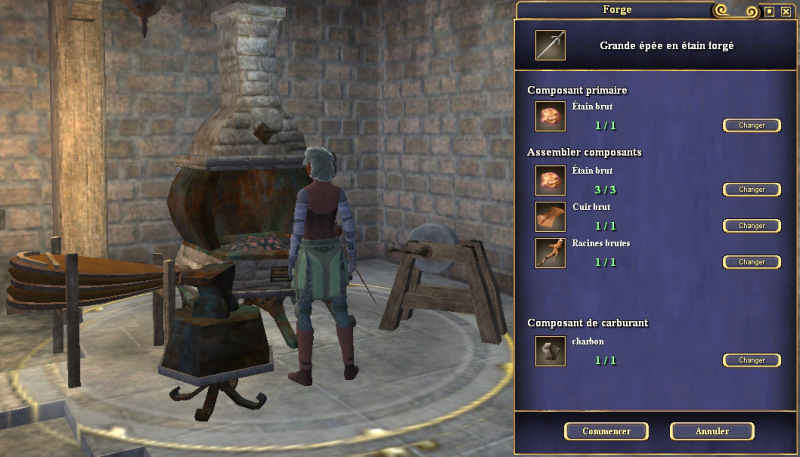Dirigez vous à la Forge. Il vous faut : 4 étain brut 1 cuir brut 1 racine 1 charbon (s'achète au grossiste)