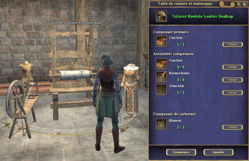 Dirigez vous à la Table de couture et mannequin. Il vous faut : 4 cuir 3 racine 1 orme brut 1 filament (s'achète au grossiste)