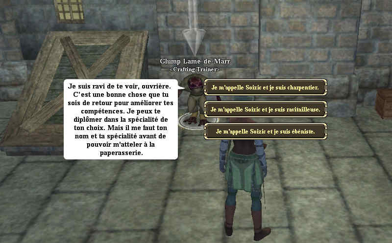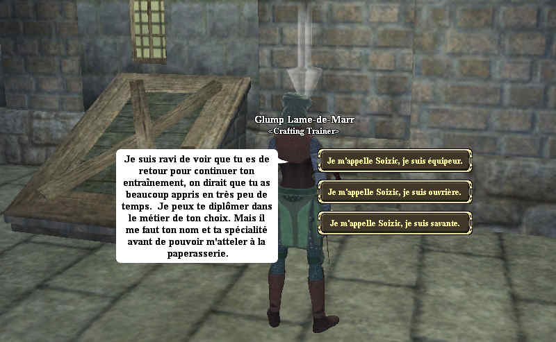 | | Comment bien choisir sa classe de craft et passer level 10 | Une fois que vous avez atteint le level 9, pas la peine de crafter plus pour passer le level 10. Il vous faut retrouner parler au Crafting Traineur pour choisir votre pré-classe de craft. Faites un clique-droit, puis saluer.