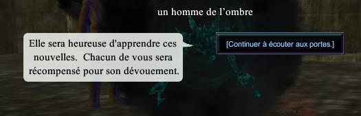 utiliser ensuite la rune dans votre sac que vous a donné Bainyn pour vous rendre invisible ,vous aurez l'air rouge , approchez ensuite des pnj afin d'espionner leur conversation , il faut rester a une distance asssez proche pour pouvoir continuer a les espionner sinon la bulle de dialogue suivante n'apparait pas