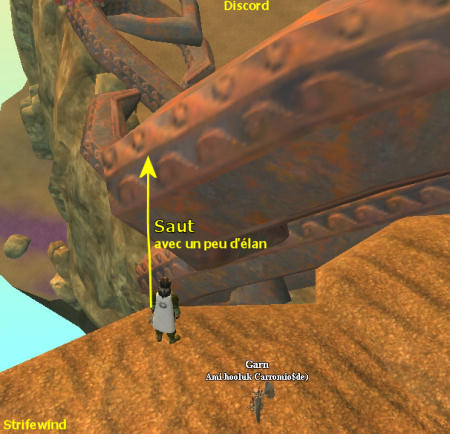 Deux methodes pour y arriver : 1 - Allez sur l'île de Discord et grimpez sur la chaine à droite du téléporteur, cela va vous faire passer au dessus du vide entre les deux îles, mais c'est la méthode la plus facile. 2 - Allez directement sur Strifewind, près de la chaine sur votre gauche après le téléporteur, et sautez sur le maillon qui se trouve dans le vide. Cela peut paraître suicidaire ainsi, mais c'est efficace. Je vous conseille d'être en tapis volant pour avoir suffisament de vitesse, et surtout une fois sur la chaine, d'arrêter de suite d'avancer pour ne pas aller trop loin et tomber (voir image de droite pour la bonne position de saut). Petite précision, une fois sur le premier maillon au bord de Strifewind, vous devrez sauter sur le second en passant sous celui qui est vertical (voir image ci-dessous). Ensuite vous pouvez monter jusqu'au bout, et contre la falaise, vous mettez votre caméra bien à la verticale au dessus de vous, pour trouver Hoo'Loh qui se cache en dessous et se laisser tomber à côté.