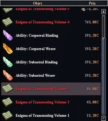 Ensuite vous achetez au marchand transmuteur à ses côtés les éléments nécessaires à cet artisanat : les 4 sorts de craft appelés Ability, ainsi que le premier livre de recettes : Enigma of Transmuting Volume 1. Vous apprenez l’ensemble et aurez donc 4 sorts en plus dans votre livre de Savoir dans les Perfectionnements et des recettes de transmuting dans votre livre de recettes (N).