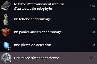 | | Etranges récompenses | ... vous avez trouvé ... Les récompenses vont varier, vous aurez droit à (valeur de revente) : - rien (et oui cela arrive) - une pièce d'argent ancienne (ou plusieurs en même temps) (10s) - un fétiche endommagé (10s) - un panier ancien endommagé (10s) - une urne ancienne endommagée (10s) - une assiette ancienne endommagée (20s) - une veste ancienne endommagée (20s) - un médaillon ancien légèrement endommagé (30s) - un livre de quête (voir plus bas) - ... Mais toujours lorsque vous trouverez un trésors, vous aurez le choix entre le ramasser, ou récupérer votre pierre de détection.