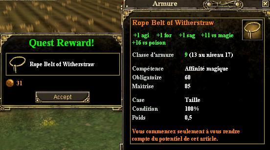 Récompense Ceinture +1 agi +1 for +1 sag +11 vs magie +16 vs poison (cf image) |