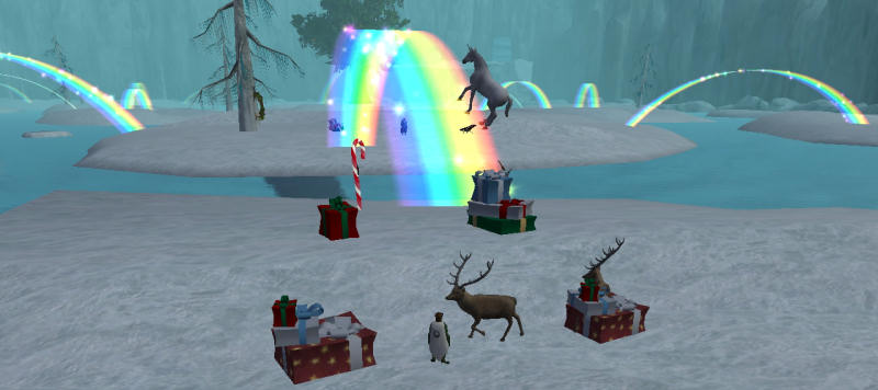 Autour du feu de camp, les faunes vous invitent à la danse, des rennes volants s'échauffent sûrement en prévision du traîneau du père Noël, et une licorne et ses suivantes dragon-fées arpentent les îlots et leurs ponts en arc en ciel.