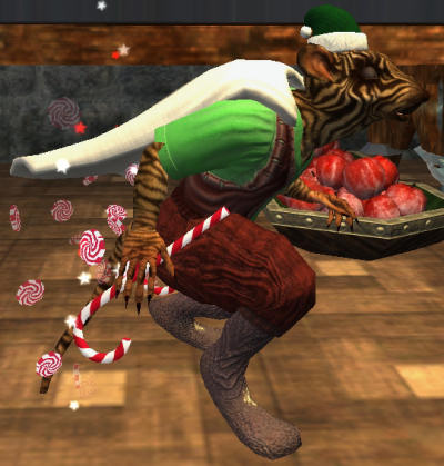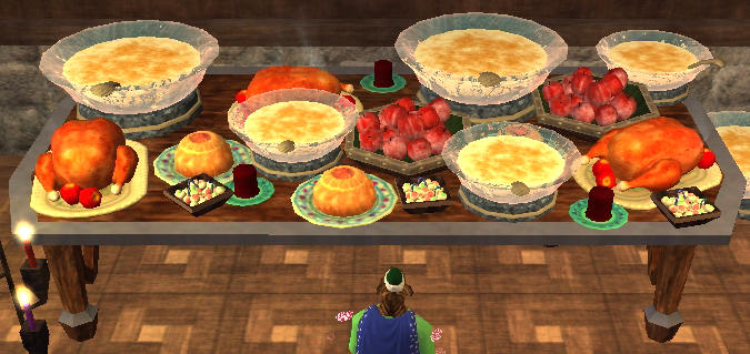 | Le fourneau : - Frosted apples - Frostfell candies - Gigglegibber cranberry sauce - Mama's eggnog - Moist Fruitcake - Spiced eggnog - Stuffed an roasted fowl - Sturdy fruitcake (se lance comme une boule de neige, mais avec des morceau de cake aux fruits) Tous ces aliments (sauf le fruitcake) sont consommables à partir de votre maison, ils donnent 15 points de réduction de statut et sont surtout fait pour accueillir et restaurer vos invités. Vous les cuisinez trois par trois, et ils ne disparaissent pas quand vos convives piochent dedans (illimités donc) mais ne peuvent être consommés que dans un appartement, et disparaissent de votre inventaire en sortant. |  |