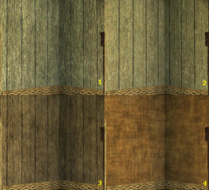 | Bas de mur 1 - Par défaut : Bois de saule crénelé 2 - 1g28s : Chêne non poli 3 - 2g56s : Chêne traditionnel 4 - 5g12s : Chêne supérieur 5 - 10g24s : Eldar opulent 6 - 20g48s : Eldar extravagant 7 - 40g96s : Riche eldar