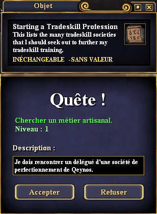 - Tout d'abord vous pouvez prendre la quête à la Queen's collony pour les Qeynosiens, à Outpost of the Overlord pour les Freeportiens. Il vous faut alors parler au Maître artisan se nommant Entraineur Gregory Collins à la Quenn's collony (-21.21, +155.92) au sud, sud-est de la carte, derrière Murrar Shar. Pour les freeportiens, son nom est Entraîneur Arthur Merrin (il est lui aussi derrière le grand bâtiment, aux mêmes points de coordonées). Il faut faire un clique-droit et cliquer sur saluer. Vous recevez alors un parchemin s'intitulant "Starting a Tradeskill Profession". Examinez le pour prendre la quête.