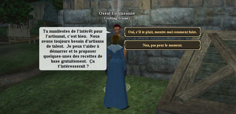En ville, une fois que vous arrivez à Qeynos ou à Portfranc, cherchez le "Crafting Trainer" qui se situe à coté de l'instance de craft de chaque ville. Il vous faut faire un clique-droit avec la sourie et cliquer sur saluer.