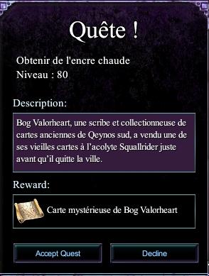 - enfin retournez a Queynos nord ,parlez a Bog Valorheart ( 337, -20, -99 ) qui vous apprendra que votre suspect lui aurait acheté une carte , il ne peux malheuresement pas vous en fournir une aussi mais si vous lui rapporter de l'encre, il vous fera une copie approximative de la carte original :)
