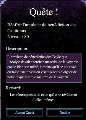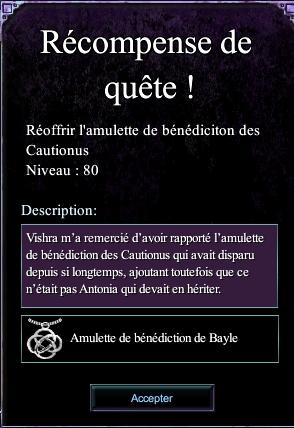 | | Rendre l'amulette a son propriétaire | Bainyn vous donnera une derniere Mission , rassurez vous c'est bientot fini :)
