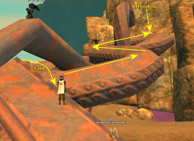 Deux methodes pour y arriver : 1 - Allez sur l'île de Discord et grimpez sur la chaine à droite du téléporteur, cela va vous faire passer au dessus du vide entre les deux îles, mais c'est la méthode la plus facile. 2 - Allez directement sur Strifewind, près de la chaine sur votre gauche après le téléporteur, et sautez sur le maillon qui se trouve dans le vide. Cela peut paraître suicidaire ainsi, mais c'est efficace. Je vous conseille d'être en tapis volant pour avoir suffisament de vitesse, et surtout une fois sur la chaine, d'arrêter de suite d'avancer pour ne pas aller trop loin et tomber (voir image de droite pour la bonne position de saut). Petite précision, une fois sur le premier maillon au bord de Strifewind, vous devrez sauter sur le second en passant sous celui qui est vertical (voir image ci-dessous). Ensuite vous pouvez monter jusqu'au bout, et contre la falaise, vous mettez votre caméra bien à la verticale au dessus de vous, pour trouver Hoo'Loh qui se cache en dessous et se laisser tomber à côté.