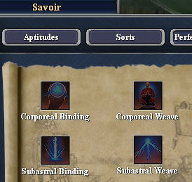 | | 2 – La constitution de l’enchantement | Vous vous retrouvez maintenant avec un petit stock de composant, il est temps de vous attaquer à votre première réalisation. Déjà ouvrez votre livre de Savoir onglet Perfectionnement et identifiez les 4 sorts appris précédemment et qui seront utilisés pour le craft : - Corporal Binding et Corporal Weave vont vous permettre de remonter la solidité de votre craft (la barre verte) - Subastral Binding et Subastral Weave vont eux augmenter la barre de progression (la bleue). Vous les prenez et les placez dans une barre de raccourci afin de les appeler plus facilement en cours de travail.