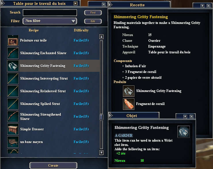 Vous remarquerez aussi que quel que soit le niveau de réussite, cela n’influe pas sur le résultat et les bonus de votre enchantement, seule la quantité d’expérience gagnée diffère (car vous gagnez quand même de l’expérience d’artisanat). Cependant en réalisant vos objets dans leur meilleur qualité (pristine, la 4ème barre de progression) vous aurez des chances de récupérer des composants ayant servi à les fabriquer.