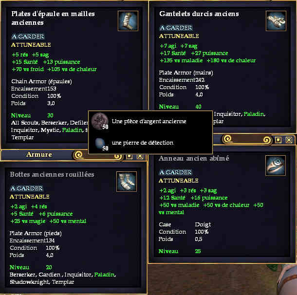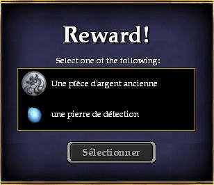 | | Etranges récompenses | ... vous avez trouvé ... Les récompenses vont varier, vous aurez droit à (valeur de revente) : - rien (et oui cela arrive) - une pièce d'argent ancienne (ou plusieurs en même temps) (10s) - un fétiche endommagé (10s) - un panier ancien endommagé (10s) - une urne ancienne endommagée (10s) - une assiette ancienne endommagée (20s) - une veste ancienne endommagée (20s) - un médaillon ancien légèrement endommagé (30s) - un livre de quête (voir plus bas) - ... Mais toujours lorsque vous trouverez un trésors, vous aurez le choix entre le ramasser, ou récupérer votre pierre de détection.