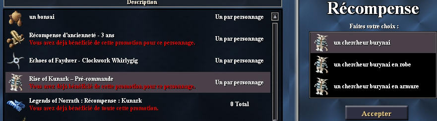 Tier / Type : Claim Catégorie : Familier Informations complémentaires Récompense de pré-commande de l'extension RoK, ce chercheur est un familier très très utile puisqu'en échange d'os, sacs de compost ou flasque d'eau (loots communs sur les corps), il vous ramène des objets de collection au hasard. Au claim ce familier est proposé en 3 modèles.